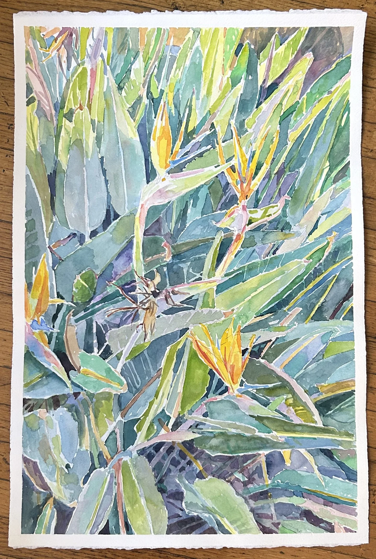 This image came about as I watched two Bird of Paradise flowers opening up a little each day, at the spot where I park my car. It seemed they were flirting with each other, or at least having a serious conversation. I approached the painting the way the flowers had opened, a little each day.